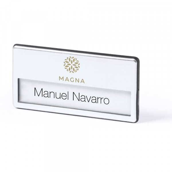 Namensschild in glänzender Ausführung. Rückseite mit doppeltem Befestigungssystem – Metallklammern und Sicherheitsstift – für sichere Justierung.