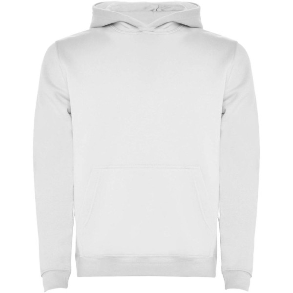 Zweifarbiger Kapuzenpullover mit doppeltem Stoff. Verstärkte und verdeckte Nähte am Kragen und an der Kängurutasche. Elastischer 1×1-Rippstrick an Ärmeln und Bund. Herausnehmbares Etikett. Das Modell ist 120 cm groß und trägt Größe 5/6.