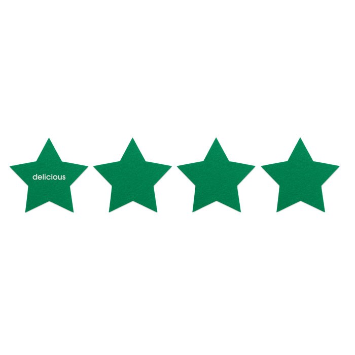 Set mit 4 Untersetzern aus RPET-Filz in Form eines Sterns. Lieferung in einer Schachtel aus Kraftpapier.
