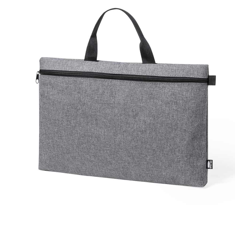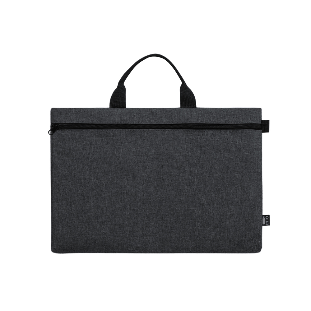 Dokumentenhalter der Natur Line und in widerstandsfähigem 600D RPET Melange-Effekt, hergestellt aus recyceltem Kunststoff, um die Wiederverwendung von Kunststoffabfällen zu fördern und zur Nachhaltigkeit des Planeten beizutragen. Schwarze Details und Hauptfach mit Reißverschluss. Stabile, passende Griffe und RPET-Plakette auf dem Außenetikett.