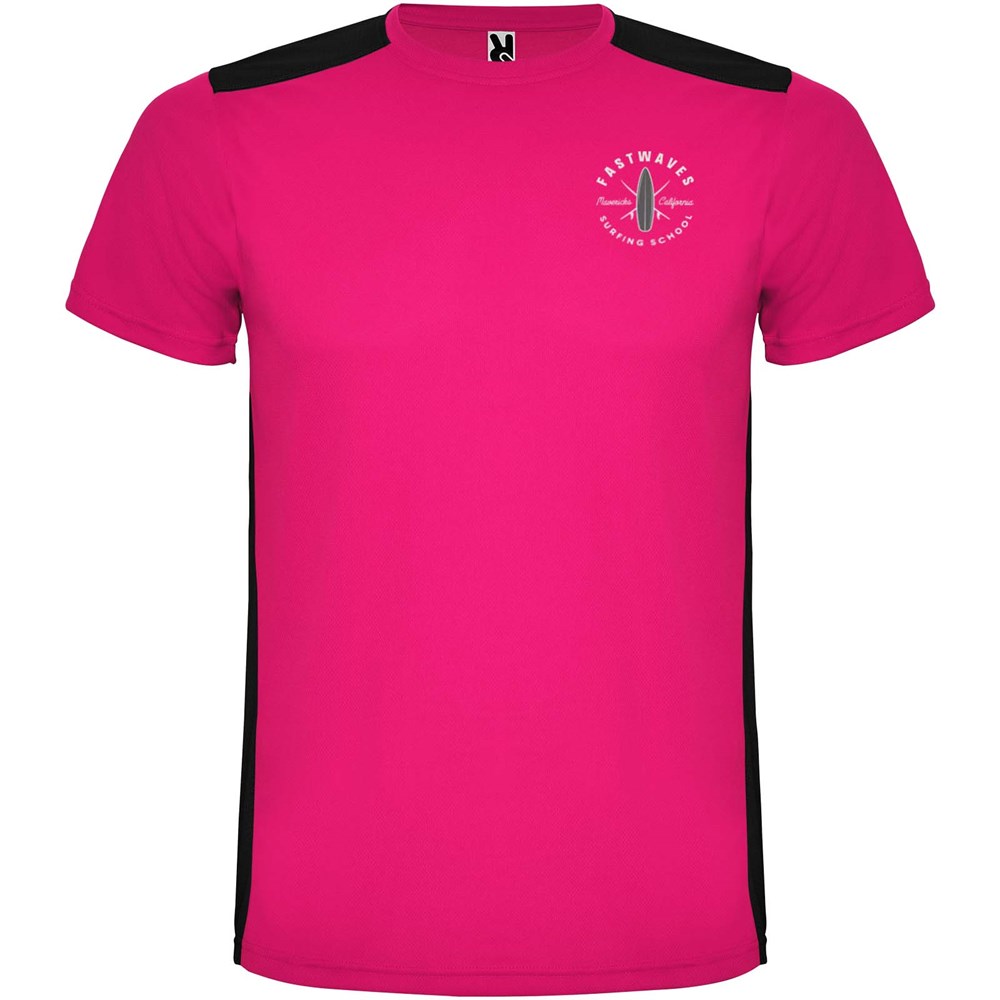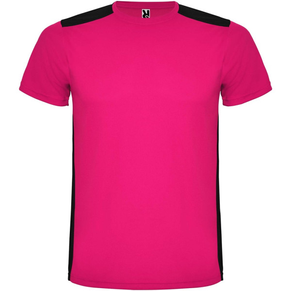 Funktions-T-Shirt aus atmungsaktivem Stoff. Rundhalsausschnitt. Kombination aus zwei Polyestergeweben im Rücken- und Schulterbereich. Polyester Bienenwabe Vorne und 3D-Netz Polyester auf Schulter und Rücken. Material ist feuchtigkeitabsorbierend. Ziernähte auf den Schultern und Seiten. Schnitt mit verlängertem Rückenteil. Abnehmbares Etikett.