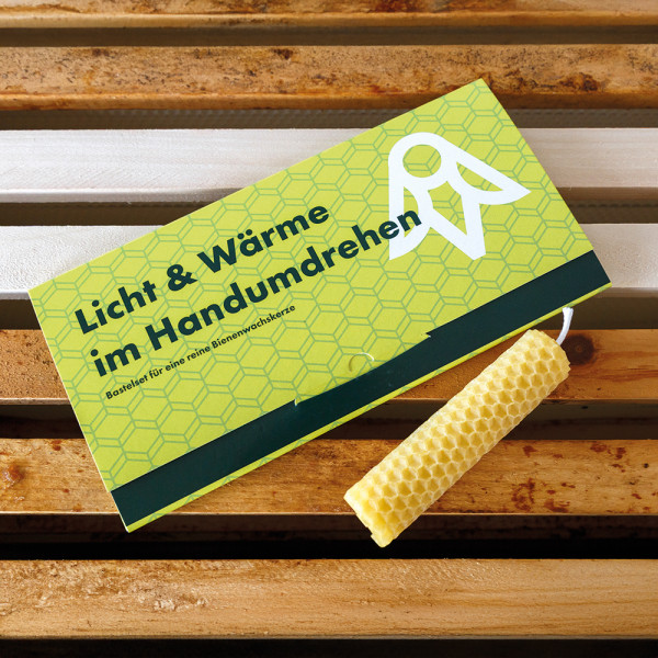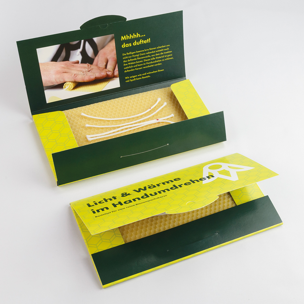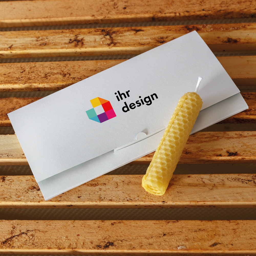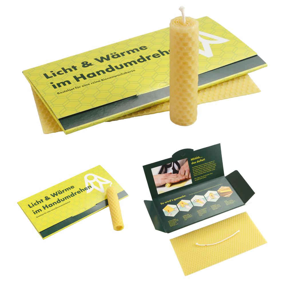 Kerzenbastelsets für eine reine Bienenwachskerze. Ein Gruß voller Wärme und Licht an Ihre Kunden oder Mitarbeiter. Das vielseitige Bienenwachs aus der beeswe.love Imkerei ist ein faszinierendes und reines Naturprodukt, das mit unseren DIY Bastelsets buchstäblich im Handumdrehen zu schönen, duftenden Kerzen verarbeitet werden kann. Wie geschaffen als Weihnachtskarte oder als Gruß in der Adventszeit. Mappe aus Karton für DIN lang mit einem Bastelset für eine Bienenwachskerze. Fertig konfektioniert mit Anleitung und Sicherheitshinweisen. Ausgezeichnet mit dem Promotional Gift Award 2023.