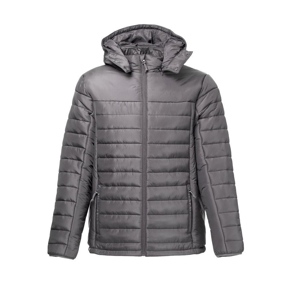 Herren Kapuzenjacke aus 100% recyceltem Nylon-Ripstop (350 g/m²) mit einem Innenfutter aus 100% recyceltem Nylontaft (350 g/m²) für mehr Tragekomfort. Die Kapuze ist gepolstert und hat verschiedene Funktionen: elastisches Band, zwei Druckknöpfe und einen abnehmbaren Reißverschluss. Vorderer Reißverschluss aus YKK®- eine Marke, die moderne Ausrüstung mit hoher Qualitätskontrolle verwendet. Es hat zwei Vordertaschen mit Reißverschlüssen und Anhänger, sowie zwei Innentaschen mit selbstklebenden Reißverschlüssen. Auf der Rückseite befindet sich ein Reißverschluss für eine einfache Personalisierung. Größen: S, M, L, XL, XXL, 3XL