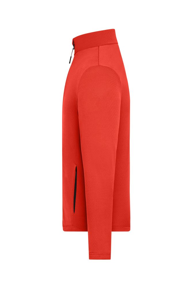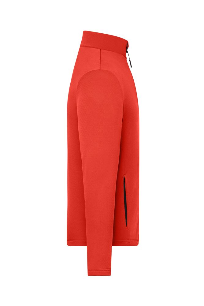 Angenehm weiche, bi-elastische Qualität Außenseite glatt, Innenseite mit strukturierter Fleeceoptik Durchgehend unterlegter Reißverschluss mit Kinnschutz 2 seitliche Taschen mit Reißverschluss Kontrastfarbige Reißverschlüsse Stehkragen JN1387: leicht tailliert 1/2 Oberweite: 50 cm 1/2 Saumweite: 49 cm Länge ab Schulter: 65 cm Ärmel Länge: 65 cm GRS Standard Stehkragen
