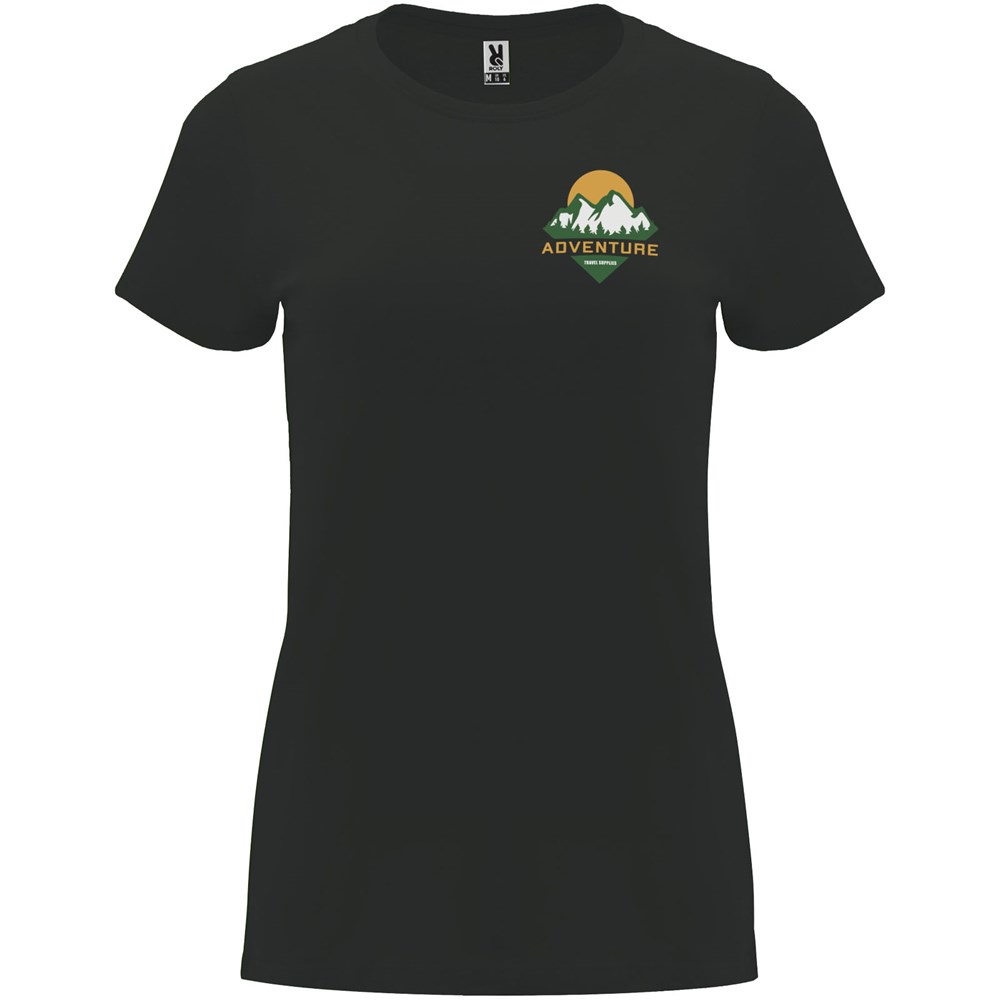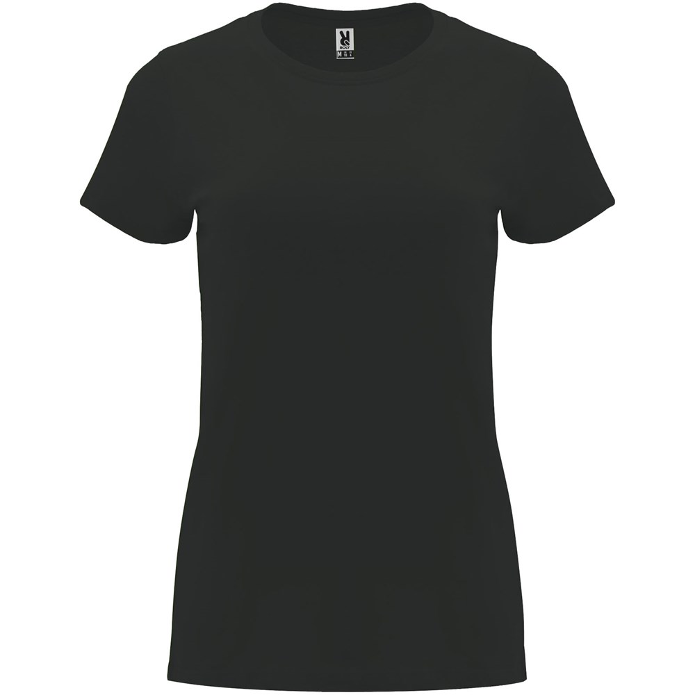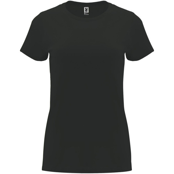 Tailliertes kurzärmeliges T-Shirt für Damen. Rundhalsausschnitt mit 1×1 Rippstrick. Verstärkte und verdeckte Nähte am Kragen. Herausnehmbares Etikett.