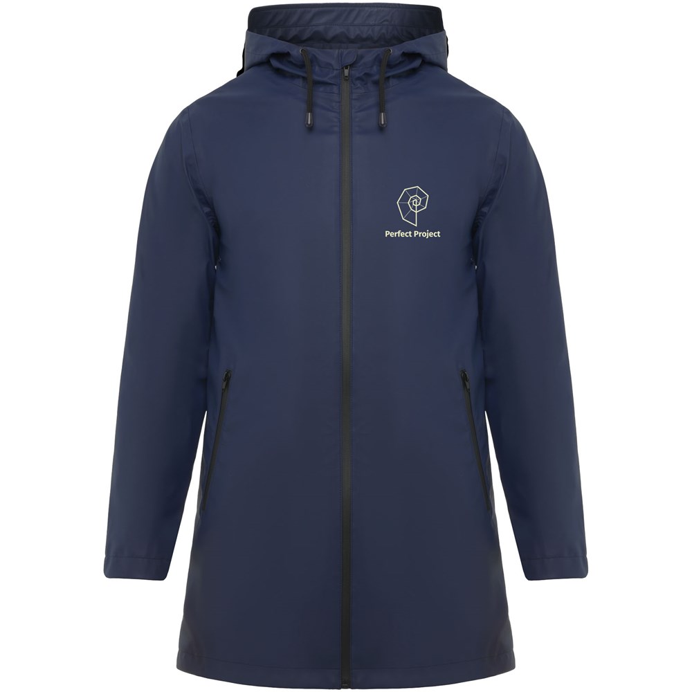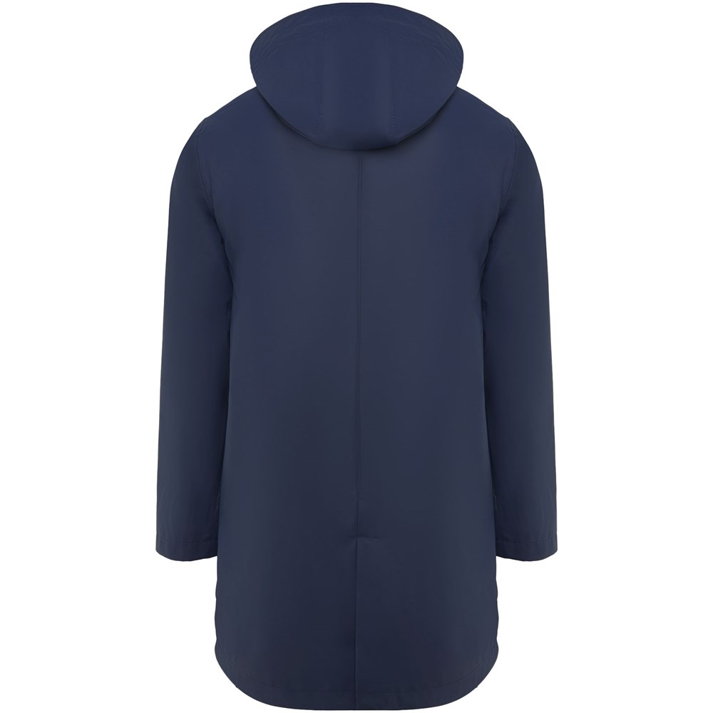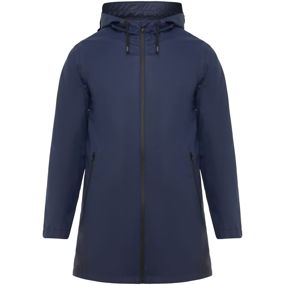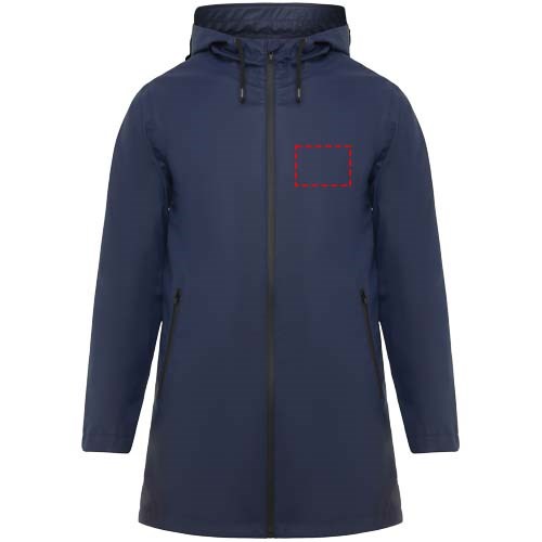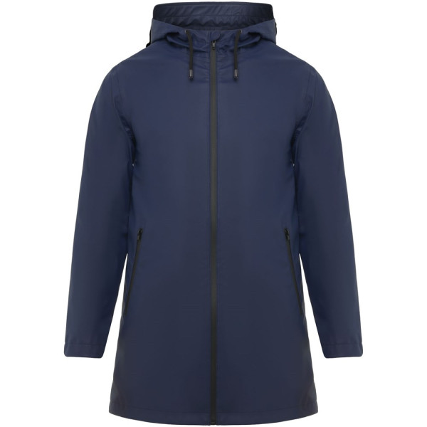 Wasserdichter Regenmantel. Kapuze mit Visier. Hitzeversiegelte Reißverschlüsse und Nähte. Kontrastierende Details in Schwarz. Zwei Seitentaschen mit Reißverschluss. Schlitz am hinteren Saum. Herausnehmbares Etikett. Wasserdicht. Das Modell ist 185 cm groß und trägt Größe M.