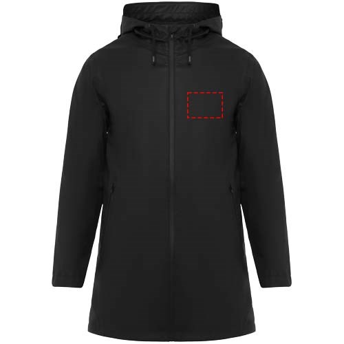 Wasserdichter Regenmantel. Kapuze mit Visier. Hitzeversiegelte Reißverschlüsse und Nähte. Kontrastierende Details in Schwarz. Zwei Seitentaschen mit Reißverschluss. Schlitz am hinteren Saum. Herausnehmbares Etikett. Wasserdicht. Das Modell ist 185 cm groß und trägt Größe M.