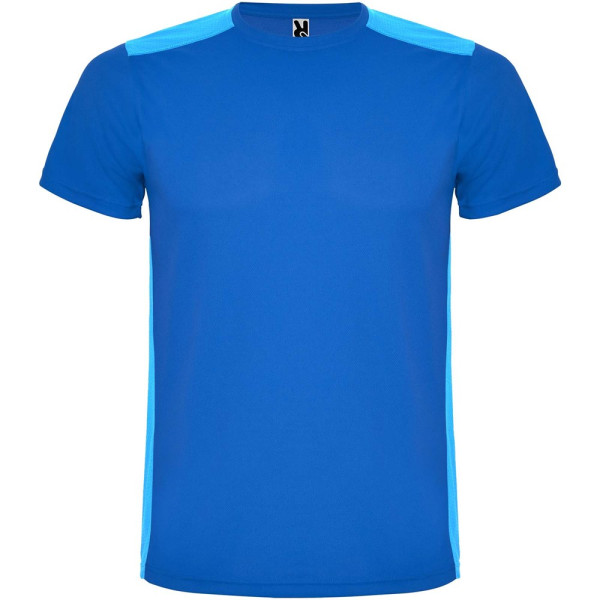 Funktions-T-Shirt aus atmungsaktivem Stoff. Rundhalsausschnitt. Kombination aus zwei Polyestergeweben im Rücken- und Schulterbereich. Polyester Bienenwabe Vorne und 3D-Netz Polyester auf Schulter und Rücken. Material ist feuchtigkeitabsorbierend. Ziernähte auf den Schultern und Seiten. Schnitt mit verlängertem Rückenteil. Abnehmbares Etikett.