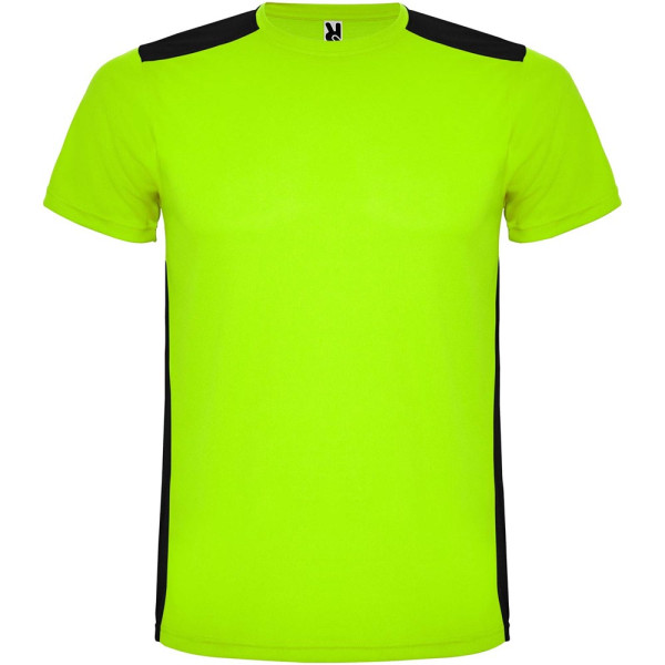 Funktions-T-Shirt aus atmungsaktivem Stoff. Rundhalsausschnitt. Kombination aus zwei Polyestergeweben im Rücken- und Schulterbereich. Polyester Bienenwabe Vorne und 3D-Netz Polyester auf Schulter und Rücken. Material ist feuchtigkeitabsorbierend. Ziernähte auf den Schultern und Seiten. Schnitt mit verlängertem Rückenteil. Abnehmbares Etikett.