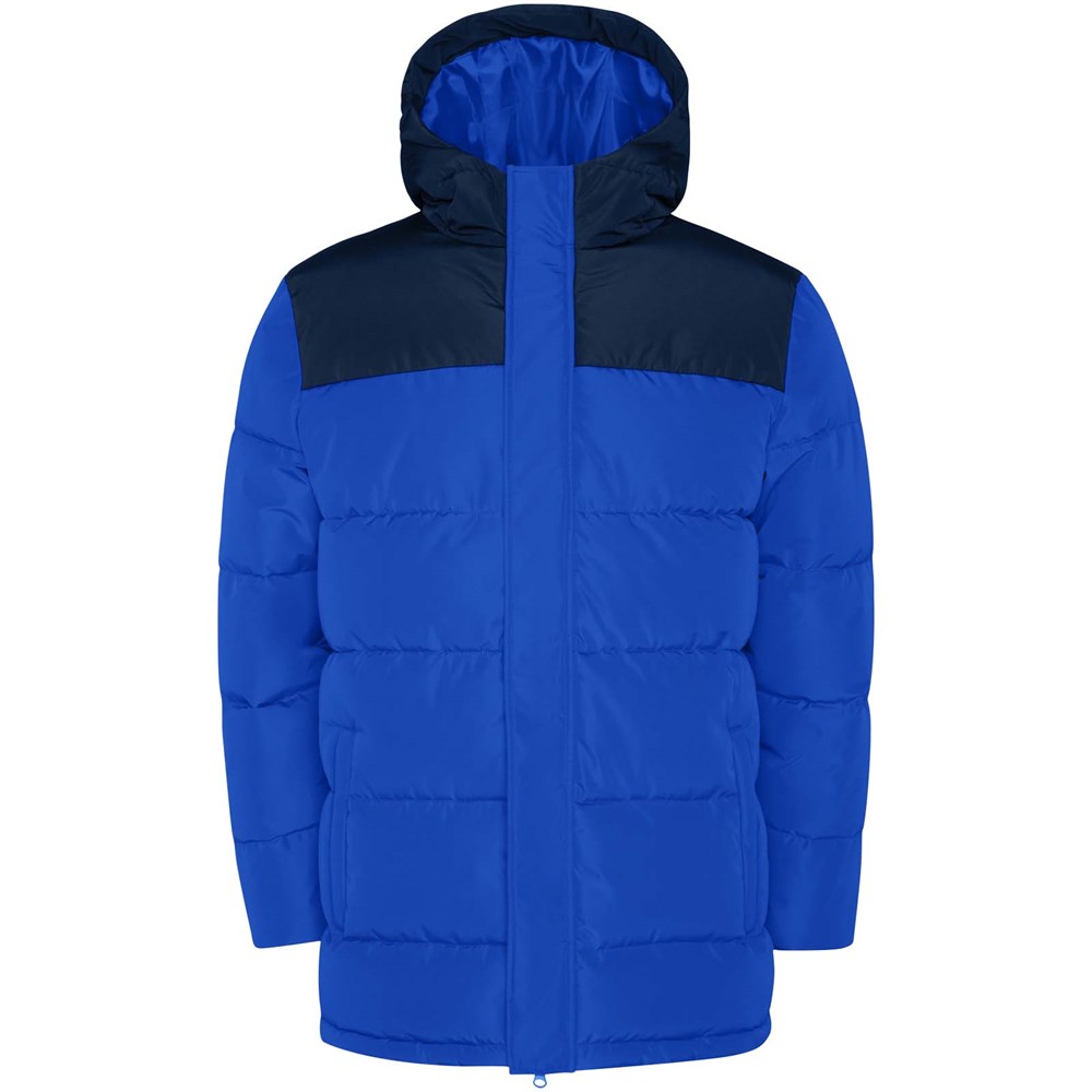 Wattierte Jacke mit fester Kapuze. Reißverschluss auf der Vorderseite, verdeckt durch eine Knopfleiste. Kinnschutz. Zwei Seitentaschen mit Reißverschluss. Elastische Bündchen.