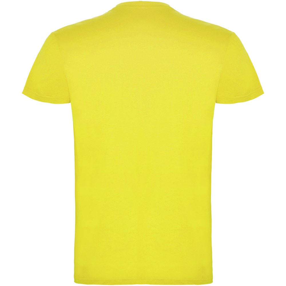 Kurzärmeliges T-Shirt mit doppellagigem Rundhalsausschnitt aus Elasthan, hergestellt aus schlauchförmigem Material für Erwachsene. Verstärkte und verdeckte Nähte am Kragen. Herausnehmbares Etikett. Das Modell ist 190 cm groß und trägt Größe L.