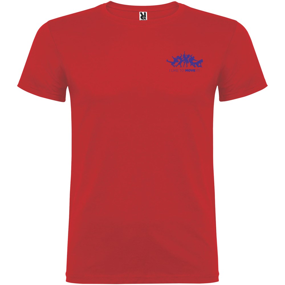 Kurzärmeliges T-Shirt mit doppellagigem Rundhalsausschnitt aus Elasthan, hergestellt aus schlauchförmigem Material für Erwachsene. Verstärkte und verdeckte Nähte am Kragen. Herausnehmbares Etikett. Das Modell ist 190 cm groß und trägt Größe L.
