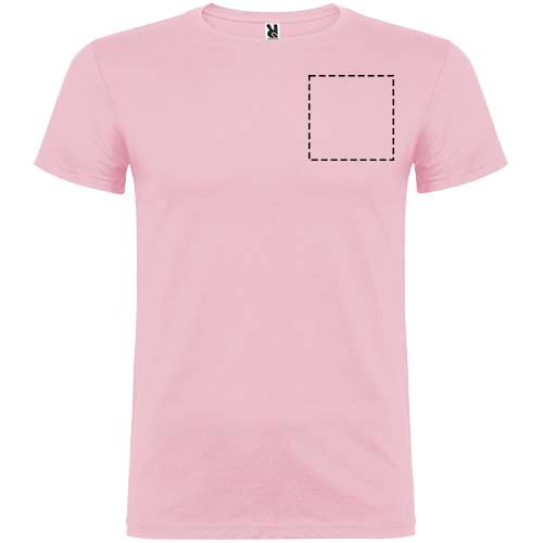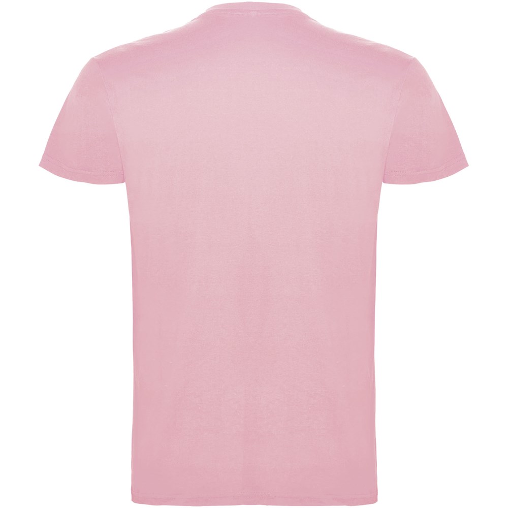 Kurzärmeliges T-Shirt mit doppellagigem Rundhalsausschnitt aus Elasthan, hergestellt aus schlauchförmigem Material für Erwachsene. Verstärkte und verdeckte Nähte am Kragen. Herausnehmbares Etikett. Das Modell ist 190 cm groß und trägt Größe L.