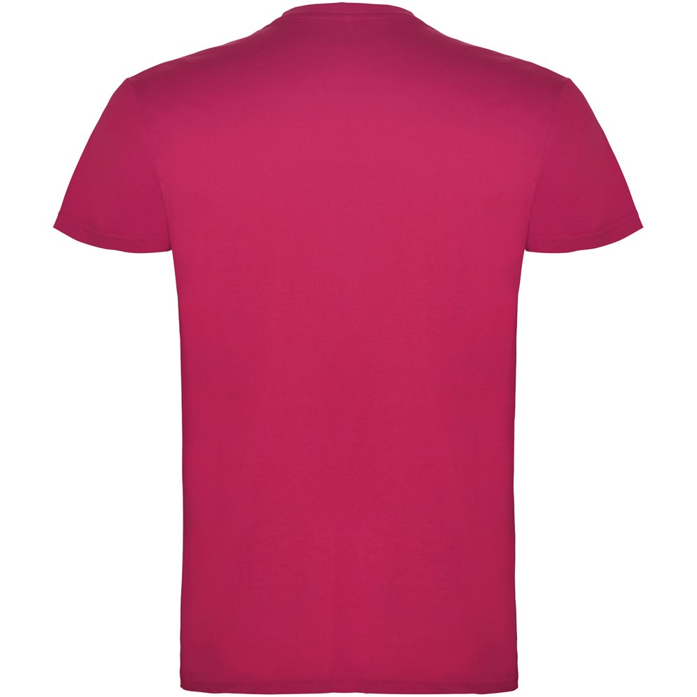 Kurzärmeliges T-Shirt mit doppellagigem Rundhalsausschnitt aus Elasthan, hergestellt aus schlauchförmigem Material für Erwachsene. Verstärkte und verdeckte Nähte am Kragen. Herausnehmbares Etikett. Das Modell ist 190 cm groß und trägt Größe L.