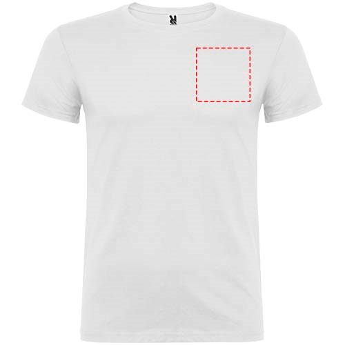 Kurzärmeliges T-Shirt mit doppellagigem Rundhalsausschnitt aus Elasthan, hergestellt aus schlauchförmigem Material für Erwachsene. Verstärkte und verdeckte Nähte am Kragen. Herausnehmbares Etikett. Das Modell ist 190 cm groß und trägt Größe L.