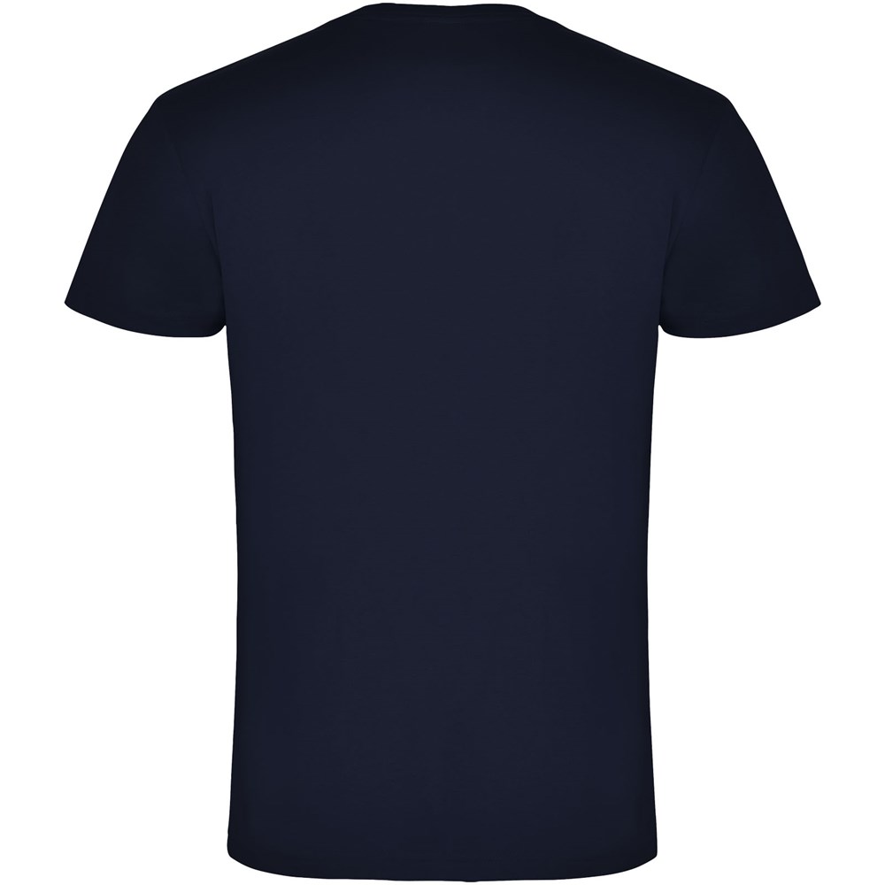 Schlauchförmiges kurzärmeliges T-Shirt mit 2-lagigem V-Ausschnitt. Verstärkte und verdeckte Nähte an Kragen und Schultern. Herausnehmbares Etikett. Das Modell ist 190 cm groß und trägt Größe L.