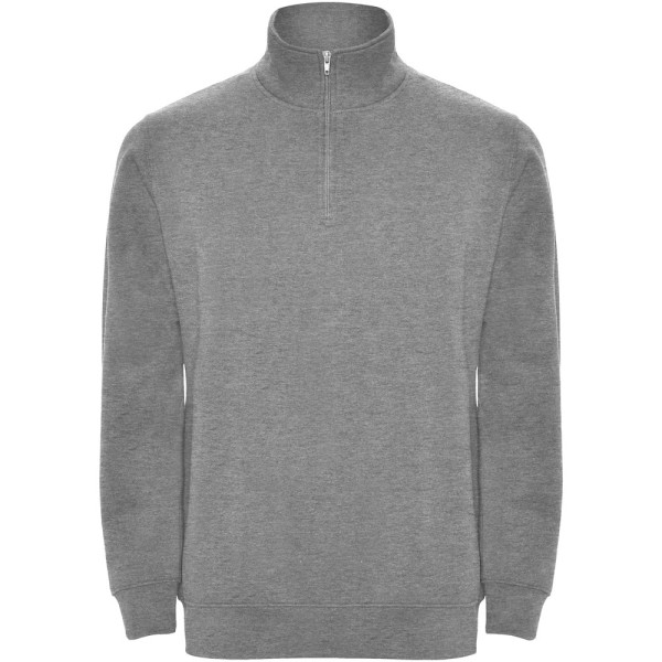 Sweatshirt mit passendem halben Reißverschluss und Polokragen. Passender Innenkragen. Verstärkte, abgedeckte Nähte am Innenkragen. 1×1 Rippbündchen an Ärmeln und Taille. Das Modell ist 185 cm groß und trägt Größe M.