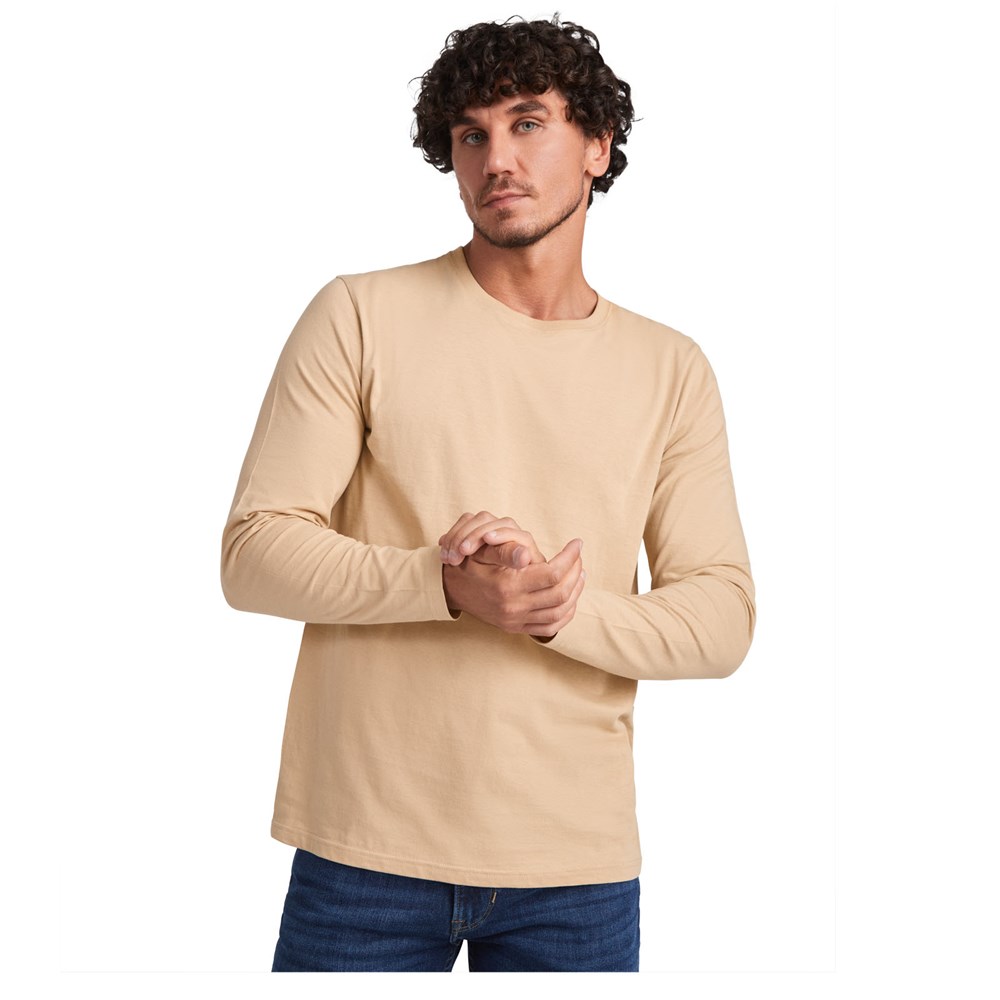 Langärmeliges Shirt aus Schlauchgewebe mit Rundhalsausschnitt aus 4 Schichten. Verstärkte Nähte an Kragen und Schultern. Keine Ärmelbündchen. Herausnehmbares Etikett. Schlauchdesign in Erwachsenengrößen und Seitennähte in Kindergrößen. Das Modell ist 185 cm groß und trägt Größe L.