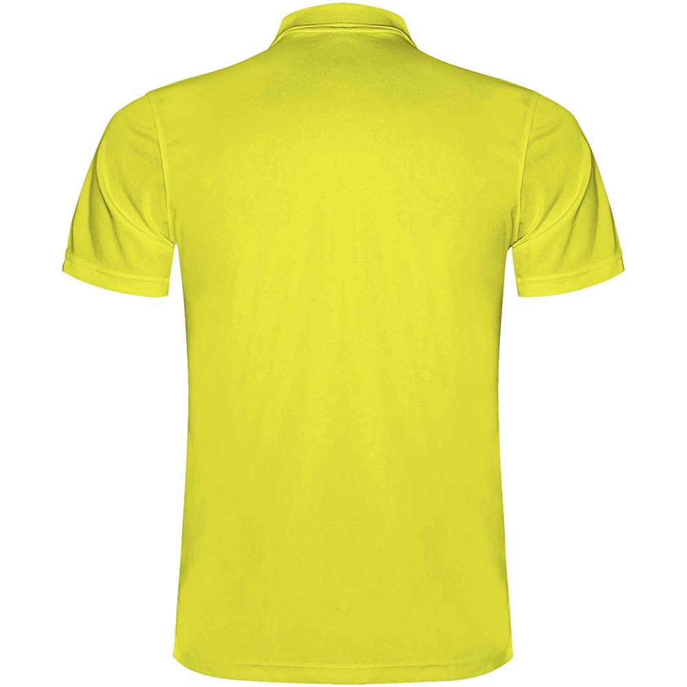 Kurzärmeliges Funktions-Poloshirt. Gestrickter Kragen mit 3-Knopfleiste. Atmungsaktives, leicht zu waschendes und zu trocknendes Material. Herausnehmbares Etikett. Technisches Gewebe. Atmungsaktiver Stoff. Das Modell ist 184 cm groß und trägt Größe L.