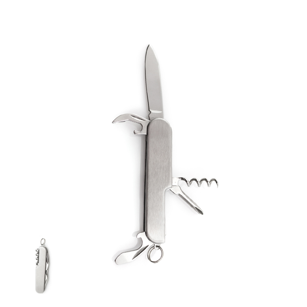 Vielseitig verwendbares Taschenmesser mit 6 Funktionen. Enthält Messer, verschiedene Öffner, Schraubendreher und Schlüsselring. Präsentiert in einer individuellen Box.
