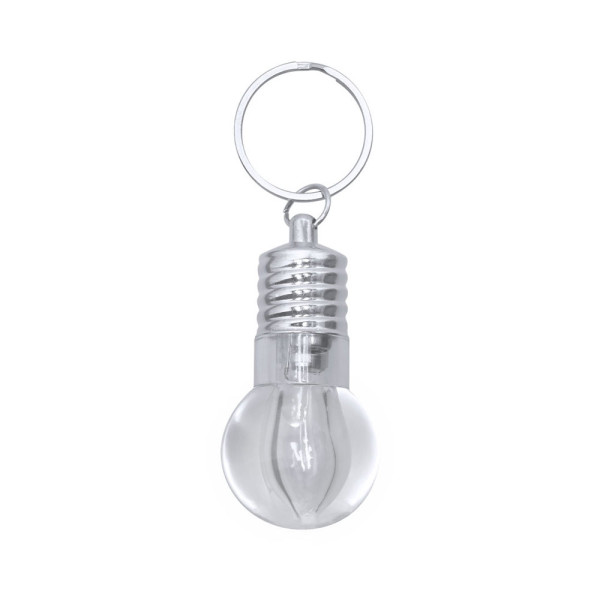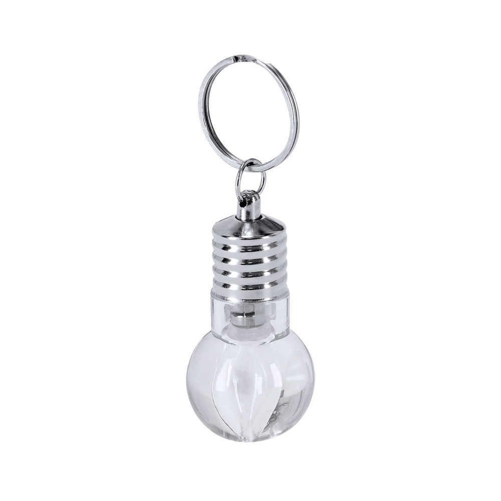 Schlüsselanhänger-Taschenlampe mit originalem glühbirnenförmigem Design. Mit einer LED, die über Knopfbatterien betrieben wird (inklusive Knopf), Ein/Aus-Knopf an der Seite sowie dekorativen Elementen und einem Chromring.