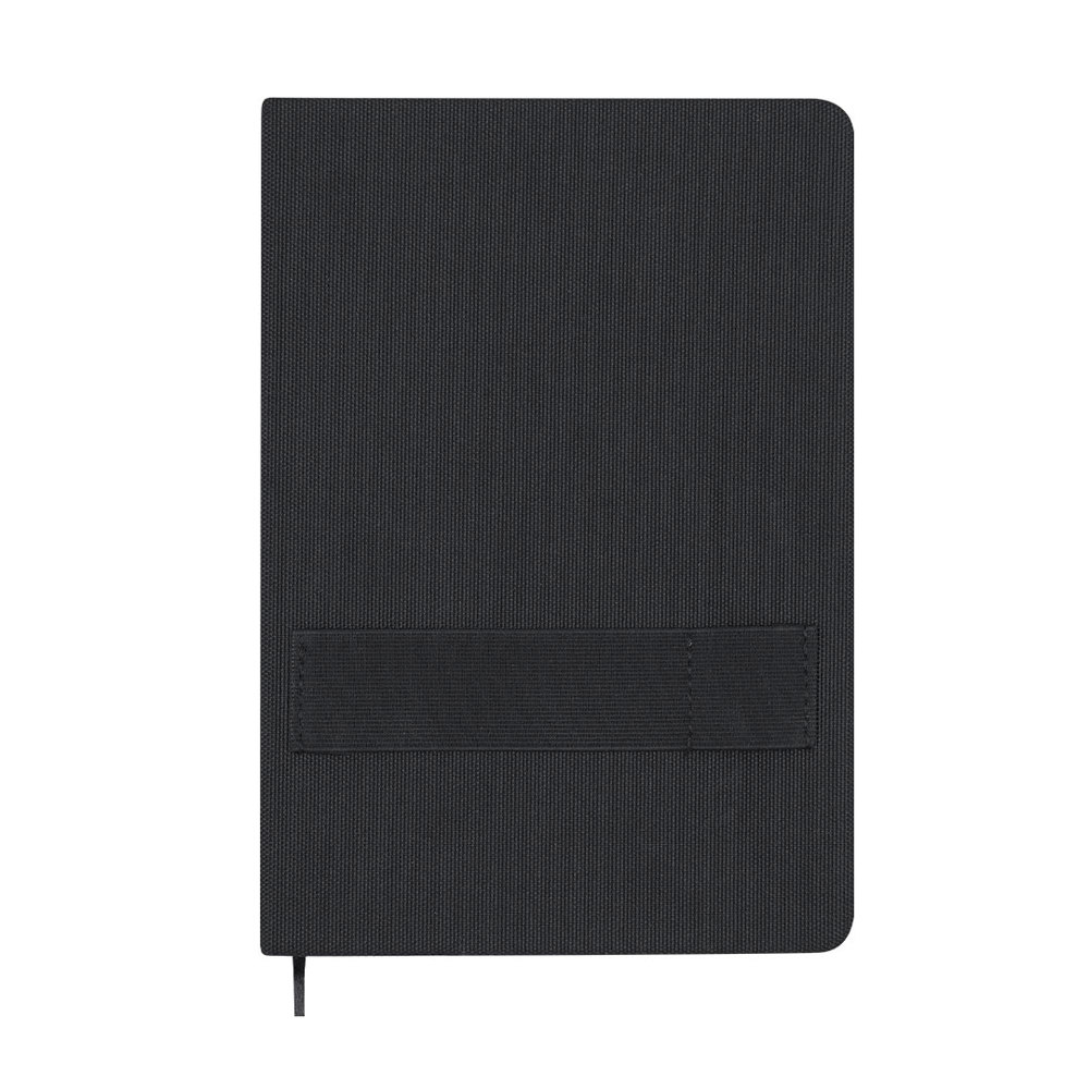 A5-Notizblock aus elegantem RPET. Starre Überzüge in Stoffoberfläche. Beinhaltet ein Gummiband am Deckel, ideal zum Aufbewahren eines Handys, sowie einen elastischen Stifthalter. Innenseite mit 80 Seiten auf einem Streifen, Band-Lesezeichen in Kombination und Umschlag auf den Rückseiten. Enthält Stift mit blauer Tinte, Aluminium-Gummilack, Metallclip und eine Druckknopffunktion in Kombination. Es zeigt ein markantes RPET-Logo.