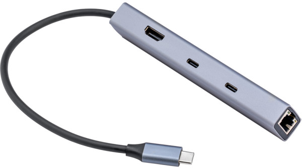 Mehr Anschlüsse braucht kaum jemand. Hub mit 100W PD Port, USB-C 3.2, 2 x USB-A 3.2, HDMI2.0 4K@60Hz, RJ45. Maße Korpus (BxHxT): 23 x 17 x 131 mm. Kabellänge 200 mm. Gewicht: 53 g. Material: Aluminium.