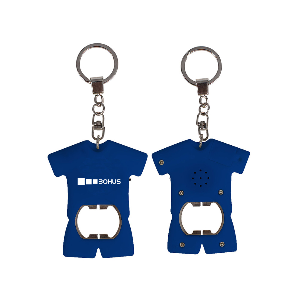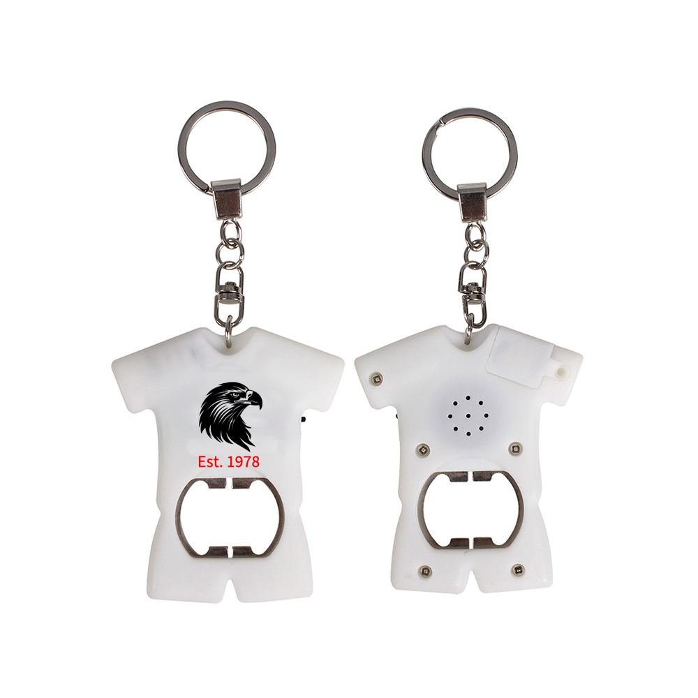 Flaschenöffner in Trikot Form mit integriertem Soundmodul und praktischem Schlüsselanhänger. Spielt beim Öffnen eines Kronkorkens den einprogrammierten Sound ab. Soundchip: 10 Sekunden, auf Wunsch auch mehrere Sounds möglich. Größere Soundchips auf Anfrage. Sounddatei: wird vom Kunden als MP3- oder WAV-Datei gestellt. inkl. Knopfzellen Batterien.