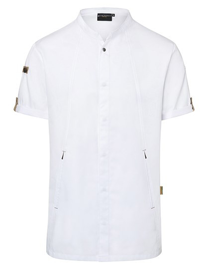 Vorderseite: Köpergewebe, 150 g/m² | Rückseite: Jersey-Piqué, 170 g/m², atmungsaktiv, feuchtigkeitsregulierend | Innovative nachhaltige Kochjacke mit kurzen Ärmeln, die urbanen Style mit natürlichem Flair verbindet | Der Artikel enthält 72% recyceltes Polyester und wurde umweltverträglich und sozial verantwortlich produziert | Leicht tailliert geschnitten | Rückeneinsatz aus Jersey-Piqué sorgt für angenehme Belüftung und erhöhte Bewegungsfreiheit | mit Druckknöpfen zum schnellen Öffnen und Schließen | Vorderteil mit Reißverschlußtaschen und Leistentasche am linken Ärmel | stylische Applikationen aus Kontrastbändern an den Ärmeln und im Nacken für eine urbane Optik | Grüner Knopf zertifiziert, www.g-k.eu/karlowsky