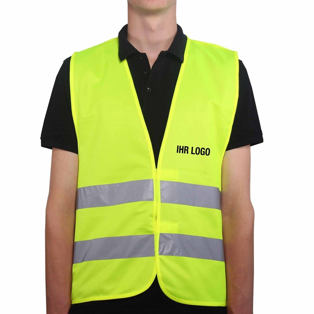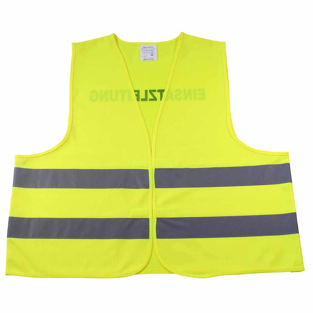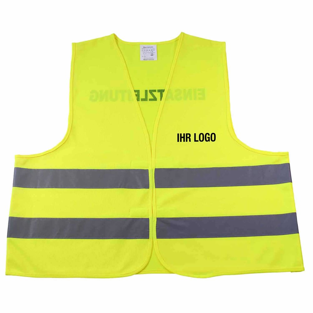 Unsere Warnweste Premium gelb ist aus 100% Polyester, wird nach EN ISO 20471 produziert und ist TÜV-Rheinland geprüft. Mit Anleitung einzeln im wiederverschließbaren Polybeutel verpackt. Durch die beiden Klettverschlüsse ist die Größe variabel einstellbar. Mit zwei reflektierenden Streifen, perfekt vernähte Qualität und Einleger in sieben Sprachen mit den gesetzlichen Pflichtangaben. Mit dem Standardmotiv 'Einsatzleitung' auf der Rückseite 1farbig schwarz bedruckt. Ein zusätzlicher Druck auf der Vorderseite ist möglich. Gern erstellen wir Ihnen dazu ein Angebot.