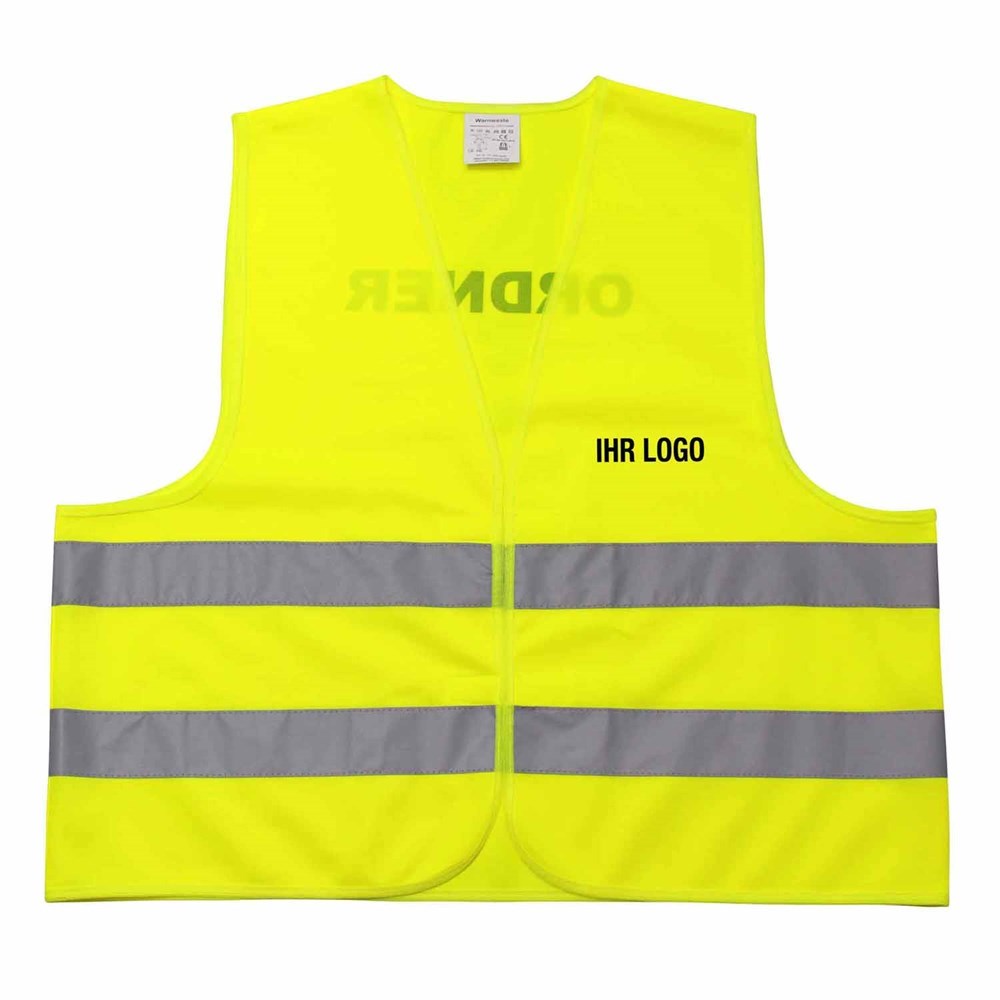Unsere Warnweste Premium gelb ist aus 100% Polyester, wird nach EN ISO 20471 produziert und ist TÜV-Rheinland geprüft. Mit Anleitung einzeln im wiederverschließbaren Polybeutel verpackt. Durch die beiden Klettverschlüsse ist die Größe variabel einstellbar. Mit zwei reflektierenden Streifen, perfekt vernähte Qualität und Einleger in sieben Sprachen mit den gesetzlichen Pflichtangaben. Mit dem Standardmotiv 'Ordner' auf der Rückseite 1farbig schwarz bedruckt. Ein zusätzlicher Druck auf der Vorderseite ist möglich. Gern erstellen wir Ihnen dazu ein Angebot.