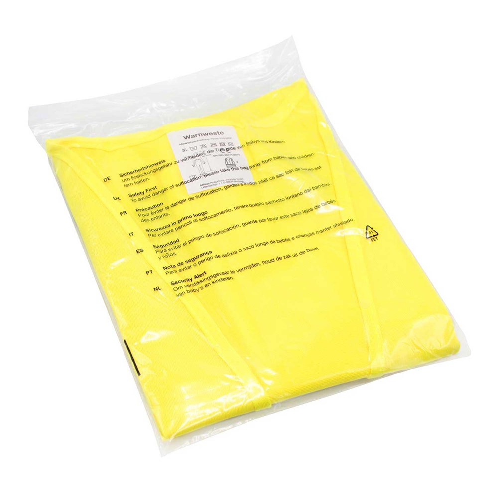 Unsere Warnweste Premium gelb ist aus 100% Polyester, wird nach EN ISO 20471 produziert und ist TÜV-Rheinland geprüft. Mit Anleitung einzeln im wiederverschließbaren Polybeutel verpackt. Durch die beiden Klettverschlüsse ist die Größe variabel einstellbar. Mit zwei reflektierenden Streifen, perfekt vernähte Qualität und Einleger in sieben Sprachen mit den gesetzlichen Pflichtangaben. Mit dem Standardmotiv 'Security Sicherheitsabstand' auf der Rückseite 1farbig schwarz bedruckt. Ein zusätzlicher Druck auf der Vorderseite ist möglich. Gern erstellen wir Ihnen dazu ein Angebot.