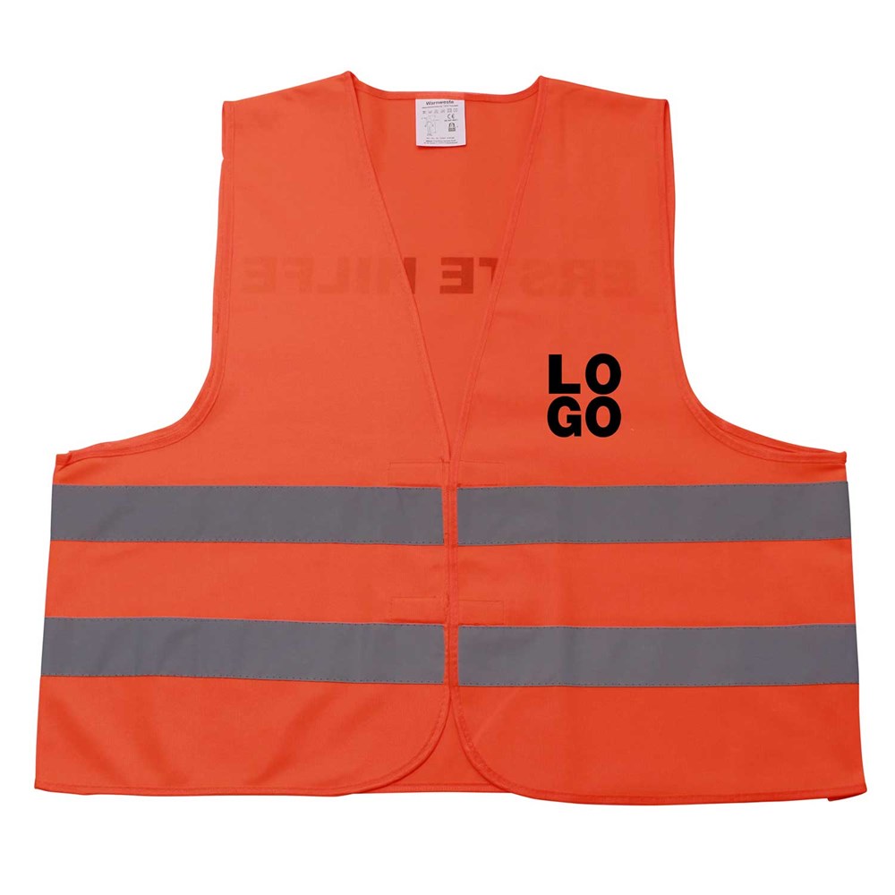 Unsere Warnweste Premium gelb ist aus 100% Polyester, wird nach EN ISO 20471 produziert und ist TÜV-Rheinland geprüft. Mit Anleitung einzeln im wiederverschließbaren Polybeutel verpackt. Durch die beiden Klettverschlüsse ist die Größe variabel einstellbar. Mit zwei reflektierenden Streifen, perfekt vernähte Qualität und Einleger in sieben Sprachen mit den gesetzlichen Pflichtangaben. Mit dem Standardmotiv 'Erste Hilfe' auf der Rückseite 1farbig schwarz bedruckt. Ein zusätzlicher Druck auf der Vorderseite ist möglich. Gern erstellen wir Ihnen dazu ein Angebot.