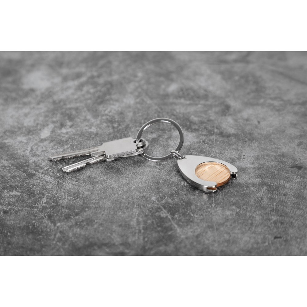 Formschöner Schlüsselanhänger aus Metall mit integriertem Einkaufswagenchip (Ø 24 mm) aus Bambus. Inklusive Schlüsselring.