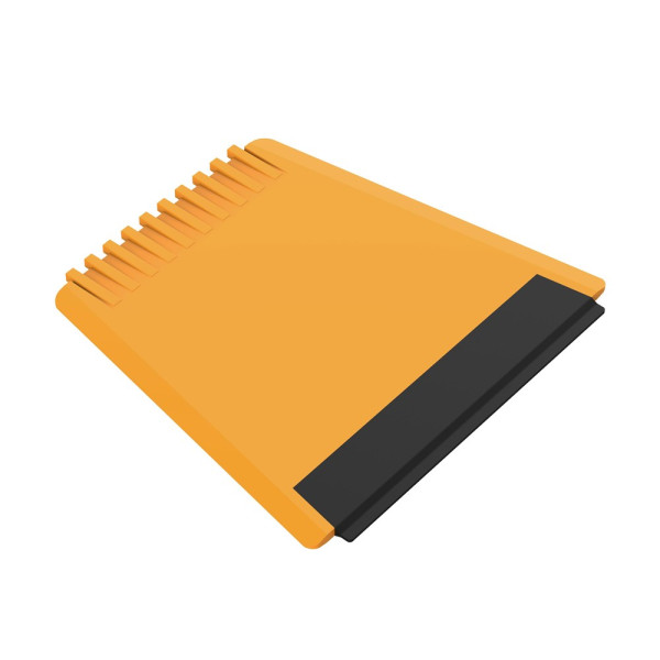 Handlicher Eiskratzer mit Wasserabstreifer, Kratzzacken und großer Werbefläche.