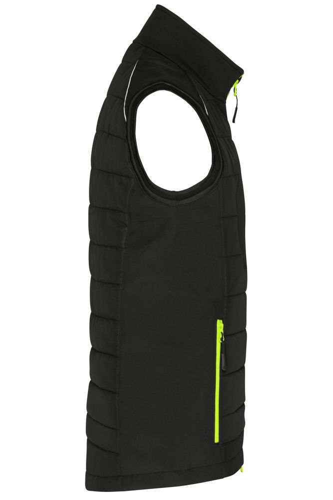 Pflegeleichtes 2-Lagen Softshellmaterial kombiniert mit gesteppten Einsätzen im Vorder- und Rückenteil