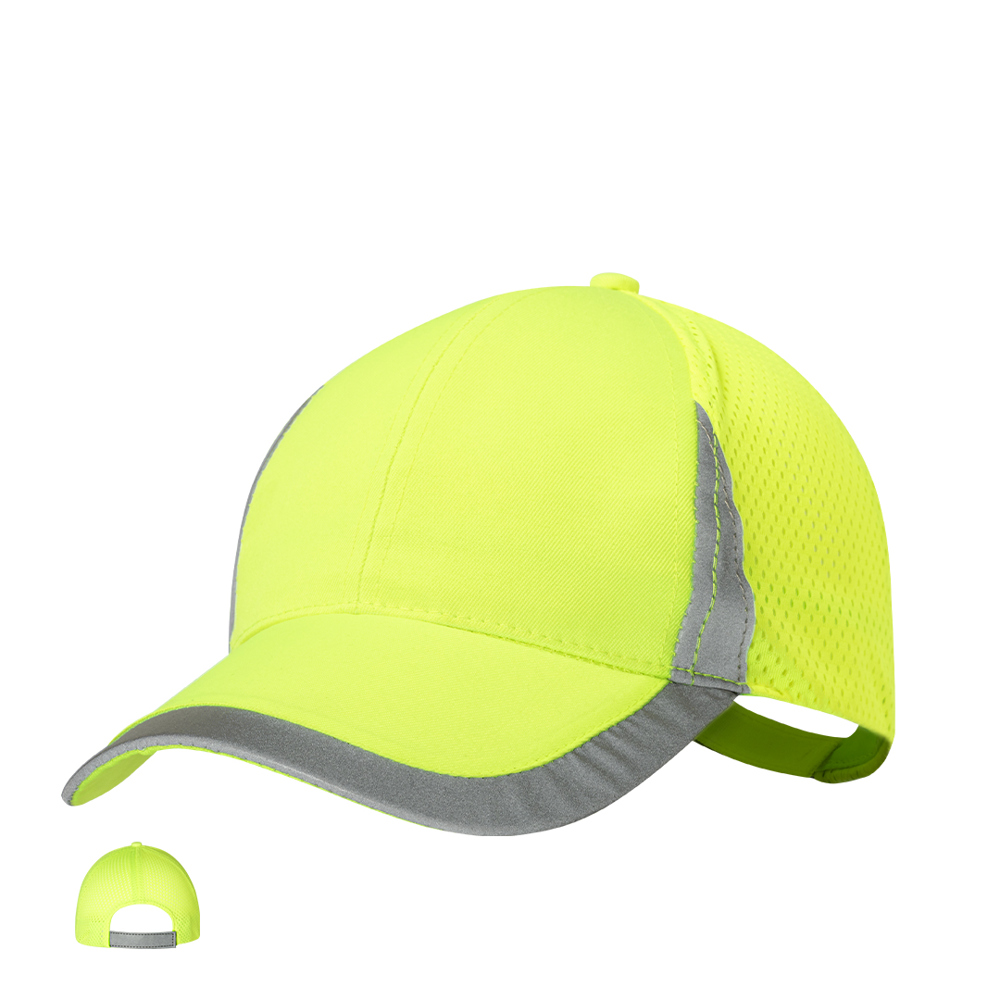 Sportmütze aus weichem Polyester. Verstellbarer Klettverschluss und atmungsaktiver Netzrücken. In fluoreszierendem Gelb mit reflektierenden Details an Schirm, Front und Verschluss.