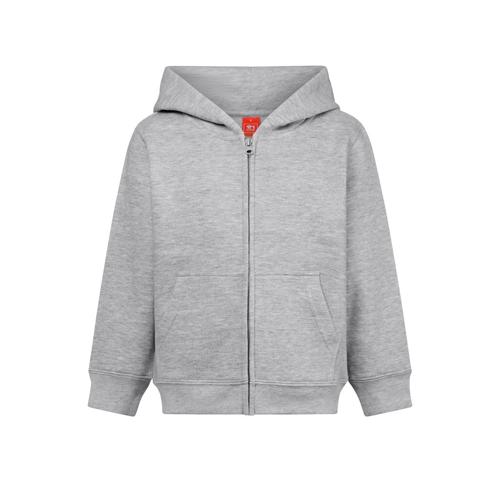 Enzym behandelte Kinderjacke aus amerikanischem Frottee (50% Baumwolle aus nachhaltigem Anbau) und 50% recyceltem Polyester (320 g/m²). Gefütterte Kapuze ohne Kordelzug mit Jersey in der gleichen Farbe wie die Jacke, entsprechend den Sicherheitsstandards der Europäischen Union. Mit 1x1-Rippbündchen an Ärmeln und Saum, 2 Seitentaschen, Reißverschluss mit Schieber, Puller und kardierter Innenseite. Größen: 4, 6, 8, 10, 12