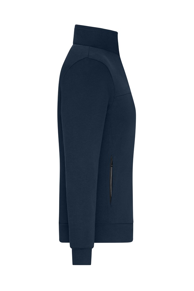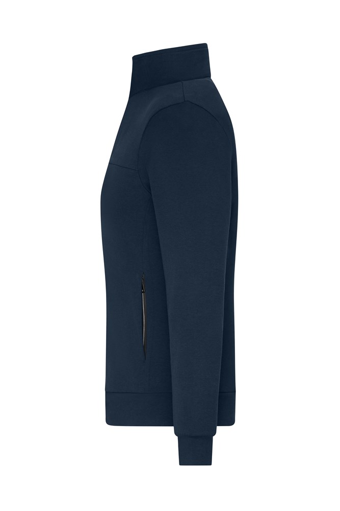 Formbeständige Interlockqualität aus Baumwolle und Polyester mit Elasthan Durchgehender Reißverschluss, Stehkragen 2 verdeckte Seitentaschen mit Reißverschluss, 2 Innentaschen Leib und Armabschluss mit Bund 1/2 Oberweite: 46 cm 1/2 Taillenweite: 42 cm 1/2 Saumweite: 45 cm Länge ab Schulter: 61 cm Ärmel Länge: 61 cm OEKO-TEX® Standard 100 (15.0.70467) Stehkragen