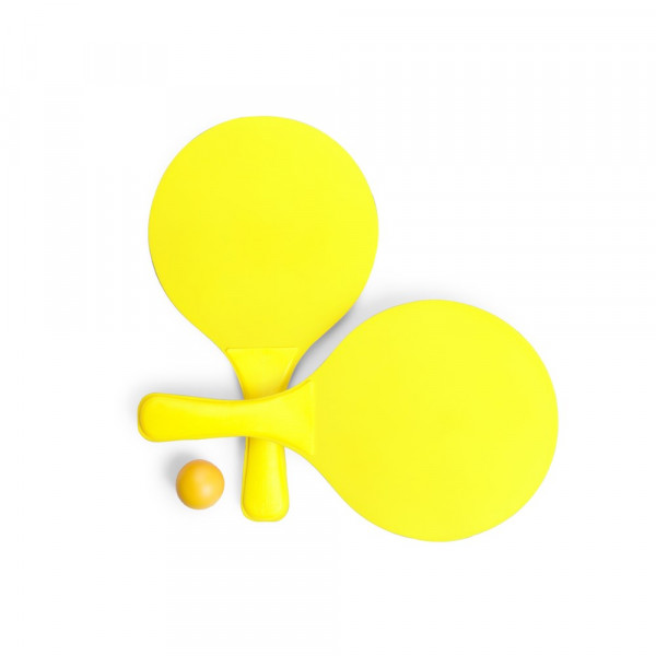 Hochwertiges Beachball-Set mit zwei Schlägern aus Naturholz in verschiedenen kräftigen Farben. Mit verstärktem Griff. Präsentiert in einer Netztasche mit Ball.