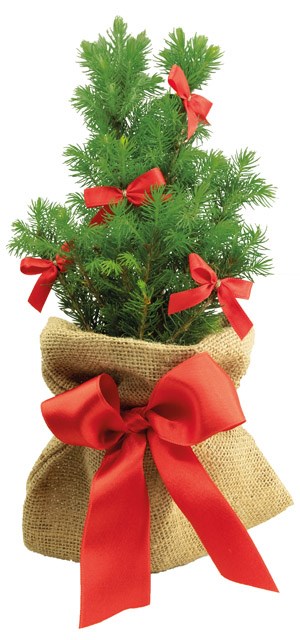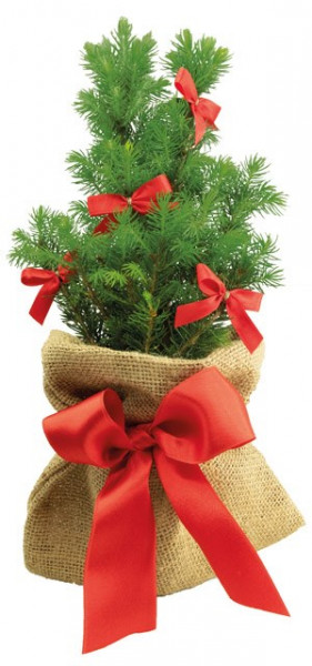Eine lebende Zuckerhutfichte 20 - 30 cm, verpackt in einer Einzelversandkartonage, als kleines Bäumchen zu Weihnachten. Im nachhaltigen Jutesäckchen ist das Bäumchen immer wieder schön anzusehen. Es kann auf Wunsch von uns direkt an einzelne Empfänger versendet werden. Geschmückt ist das Bäumchen mit 5 roten Schleifen. Ein Werbeeindruck kann auf unserem Anhängekärtchen Artikel 6202 (40 x 60 mm) ab 100 Stück erfolgen oder auf einer Beilage nach Wunsch. Zudem steht als Werbefläche ein separater Schuber, Art.-Nr. 4199-8, zur Verfügung.