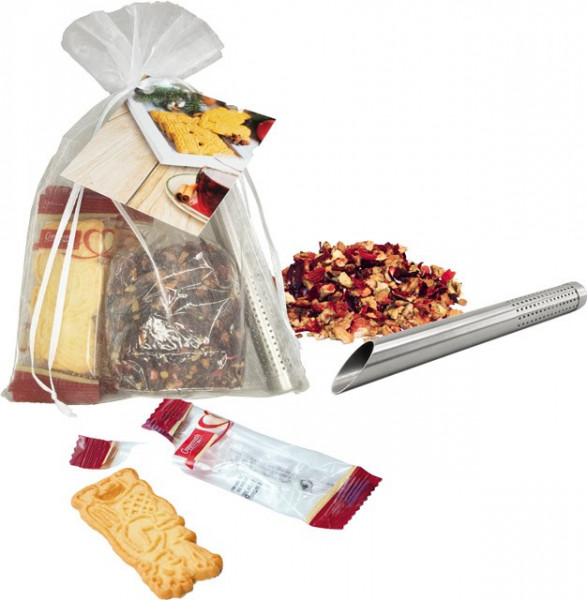 Inhalt: Edelstahl-Teestab, ca. 50 g Weihnachts-Früchtetee, 4 Butterspekulatius (je 6,5 g)