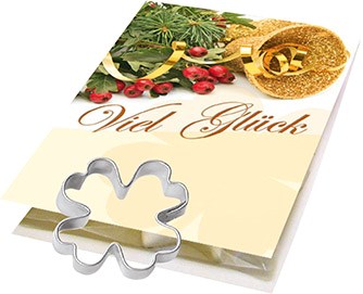 Ein nettes und nützliches Giveaway für die Adventszeit und zu Weihnachten. Dieses kleine Kärtchen beinhaltet eine Kleeblatt-Ausstechform, die jedes Jahr wieder verwendet werden kann. Ein passendes Rezept befindet sich auf der Rückseite der Karte. Platz für den Werbedruck ist auf dem Standardmotiv der Karte oder eine eigene Gestaltung des Kärtchens, jeweils bereits ab 250 Stück. Inhalt: Ausstechform Kleeblatt ca. 5 cm, Rezept auf Karte (ohne Gebäck)