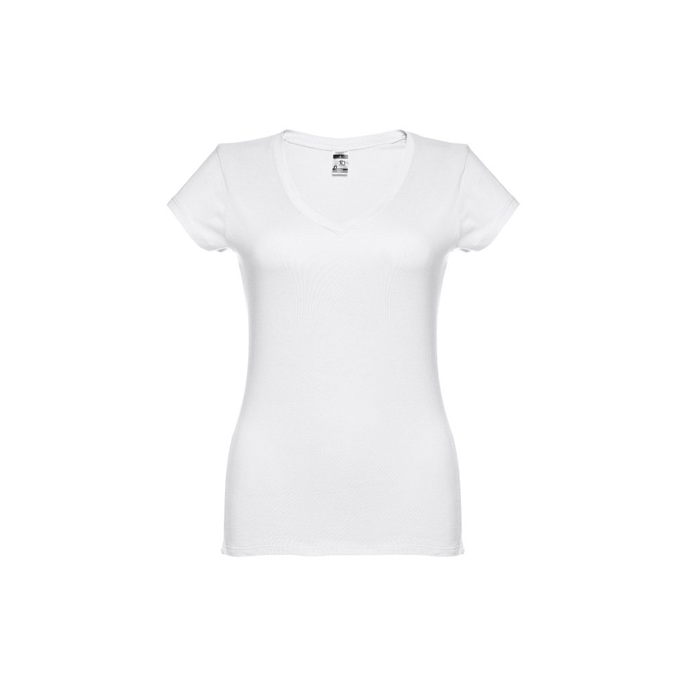 Damen T-Shirt aus 100% Strickjersey und Baumwolle (150g/m²) mit kardiertem Baumwollfaden, tailliert, überlapptem V-Ausschnitt, Verstärkungsband, Jersey-Kragen und Doppelnaht an Ärmeln und Saum. Größen: S, M, L, XL, XXL