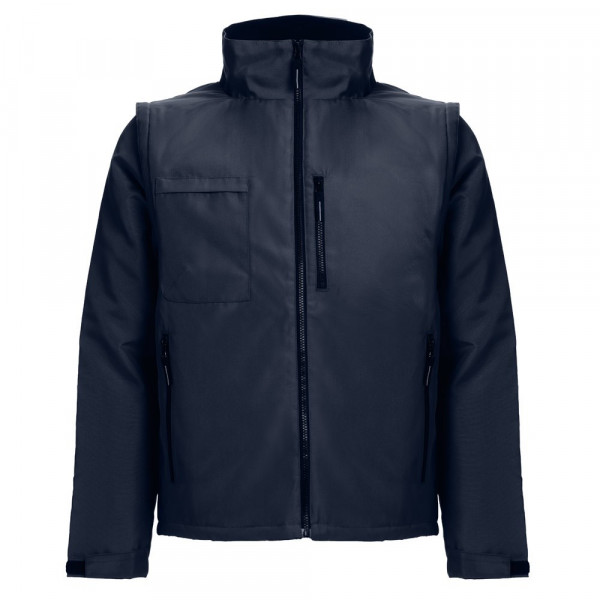 Arbeitsjacke aus 100% Polyester, unisex und gepolstert - Außenseite aus 100% Oxford Polyester mit Acrylbeschichtung (170g/m²), Füllung aus 100% Polyester (75g/m²) und Innenseite aus 100% Polyester-Taft (65g/m²). Diese kann durch abnehmbare Ärmel mittels Reißverschluss in eine Weste umgewandelt werden. Gefütterter Kragen mit Polar Mesh. 3 Reißverschlusstaschen. Der Reißverschlusszugang auf der Rückseite vereinfacht die Veredelung. Größen: S, M, L, XL, XXL, 3XL