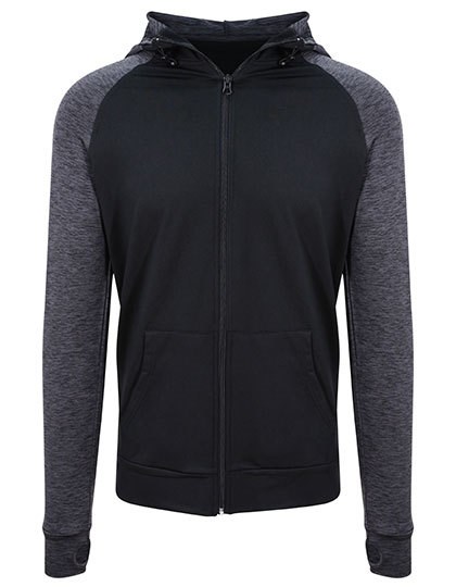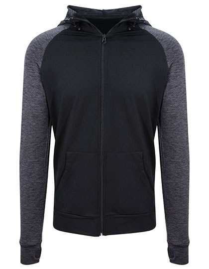 Slim Fit und | Mischgewebe von AWDis mit Elasthan für hohen Tragekomfort und hervorragende Passform | Feuchtigkeitsableitendes, schnell trocknendes Material | Durchgehender Reißverschluss an der Vorderseite | Ärmel in melierter Kontrastfarbe | Kängurutasche | Hinten verlängerter Saum | Kapuze mit verstellbaren Knebeln | Daumenöffnungen | Raglan-Ärmel | Abreißetikett